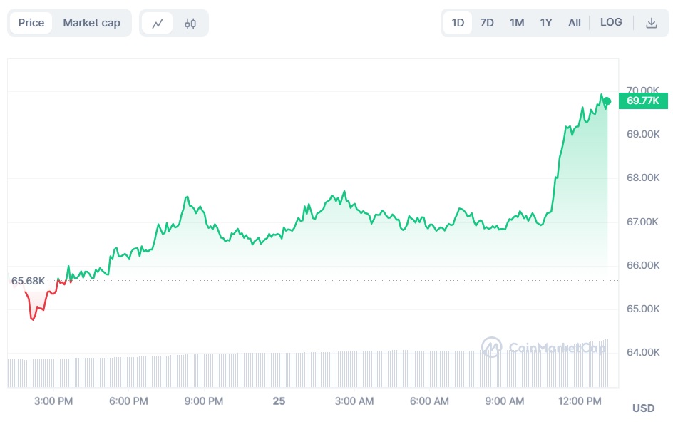 En medio de una continua volatilidad, Bitcoin surgió por encima de los $69,900 durante horas de la mañana (EDT) del 25 de marzo, registrando su mejor precio en la semana y acumulando ganancias de poco más de 6% en las últimas 24 horas. El resto del mercado de criptomonedas también se pintó de verde, con algunos tokens experimentando ganancias aún más pronunciadas en términos porcentuales.