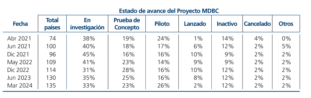 Gráfica desglosada de Distribución de proyectos de exploración de CBDC por etapa de avance / Fuente: Banco Central de Chile (cbdctracker)