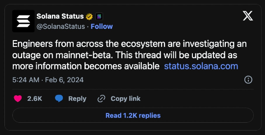 La red de Solana se cayó más recientemente en febrero. Fuente: X