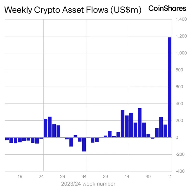 En cuanto a entradas por criptoactivo, Bitcoin representó $1,160 millones de las entradas totales, reflejando el optimismo en el mercado. Ether ocupó el segundo lugar con $26 millones de dólares en entradas. Los inversionistas parecen estar aprovechando la volatilidad tras la aprobación de los ETF de Bitcoin al contado en EE.UU. para generar oportunidades de trading.