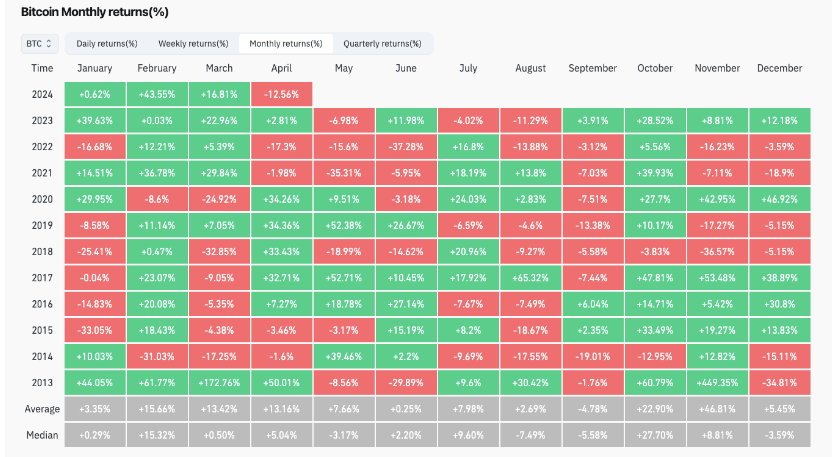 Rendimientos mensuales del par BTC/USD (captura de pantalla). Fuente: CoinGlass