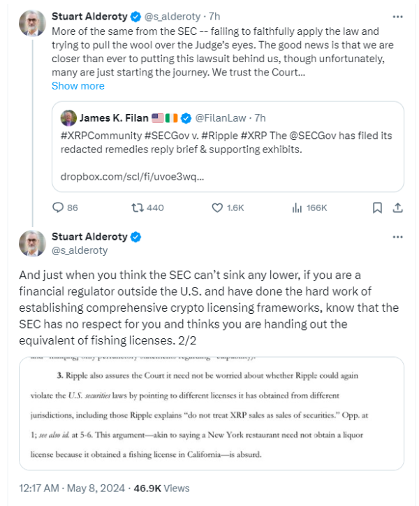 En respuesta a las afirmaciones de la SEC, el director jurídico de Ripple, Stuart Alderoty, criticó a la agencia por no aplicar la ley con coherencia y expresó su optimismo acerca de la resolución de la demanda. Alderoty también destacó que los reguladores financieros internacionales con sólidos marcos de concesión de licencias de criptomonedas podrían sorprenderse de la postura de la SEC.