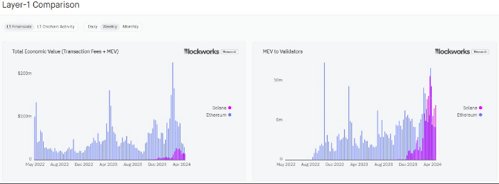 El MEV capturado se refiere a las ganancias que se obtienen principalmente a través del arbitraje en los protocolos y mide la cantidad máxima de valor que puede extraerse de una cadena de bloques por parte de los usuarios. Además de las tarifas de transacción, el valor económico total de Solana, estimado en $2.8 millones, se acerca al de Ethereum, que se sitúa en $3.1 millones.
