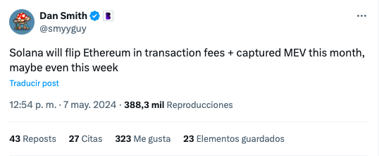 “Solana superará a Ethereum en tarifas de transacción + MEV capturado este mes, quizás incluso esta semana.”